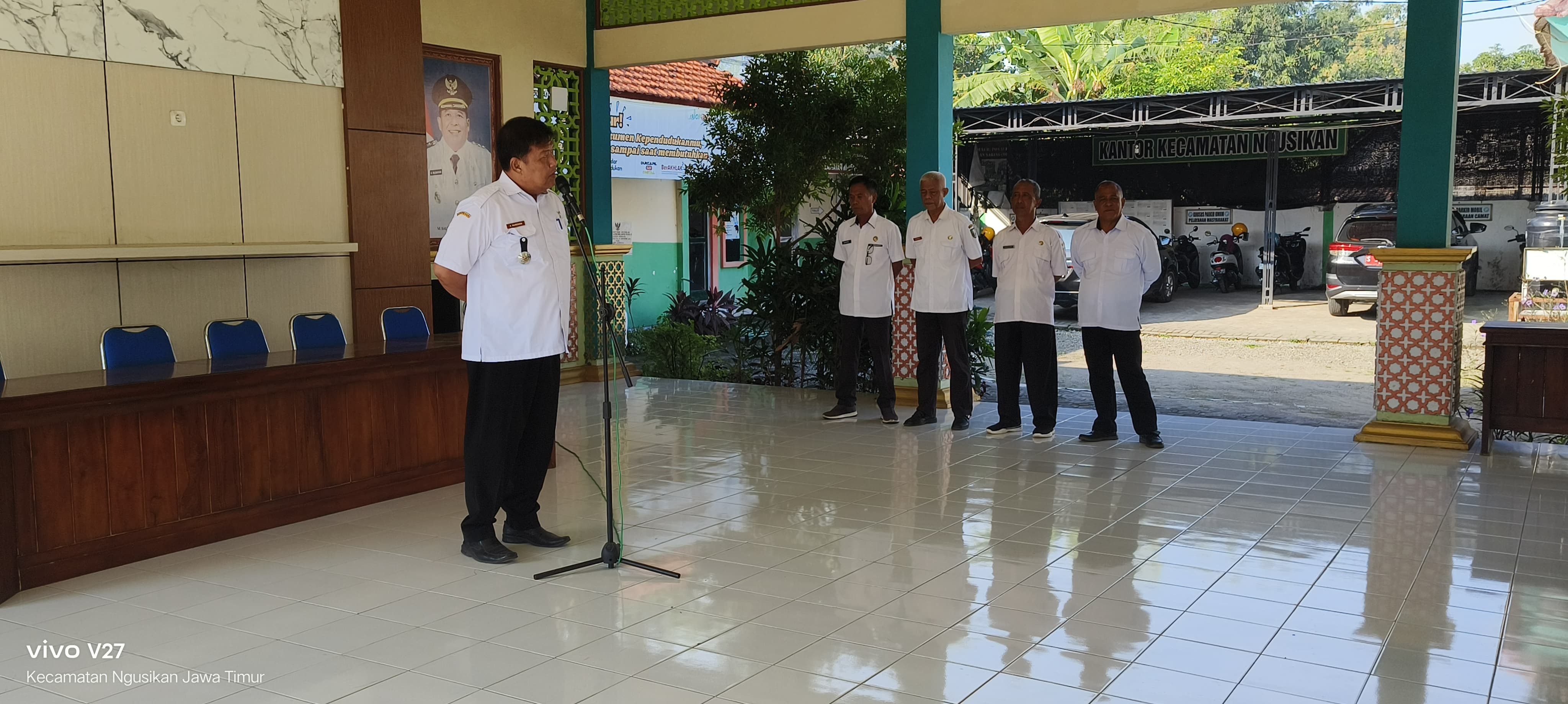 Amanat apel pagi yang di pimpin oleh Bapak Camat Ngusikan ada beberapa yang di sampaikan oleh beliaunya yang pertama ucapan terimakasih atas kehadiran dan keikut sertaan dalam apel pagi, yang kedua di tingkatkan lagi rasa kedisiplinan dalam penyelenggaraan dan pelayanan kepada masyarakat khusunya pada warga masyarakat yang ada di wilayah kecamatan Ngusikan.